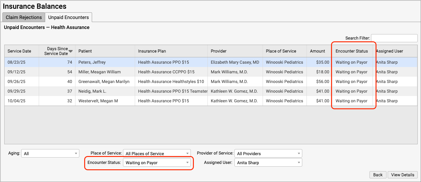 As you work on your practice’s insurance A/R, you can mark encounters with a status, such as “Waiting on the Payor” or “Under Review”. Then you can track, organize, and filter your A/R by that status.