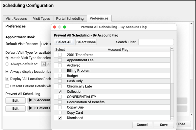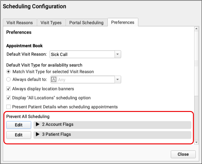 Prevent patients and accounts from being scheduled by assigning patient or account flags. In PCC EHR’s Scheduling Configuration window’a Preferences tab, select which flags should prevent scheduling by clicking Edit for either Account or Patient Flags, and checking the box for each flag that should prevent scheduling.