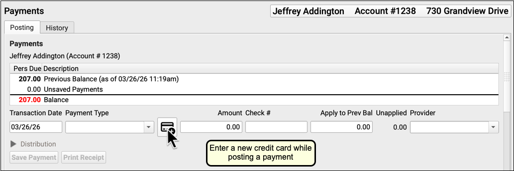 At the front desk, or whenever you are working with a family, you can use the Payments component to add the account’s credit card information.