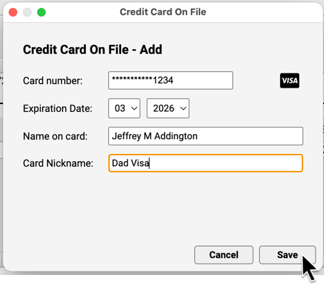 Credit card numbers are stored through an encrypted connection to a third party and are not kept on your PCC system.