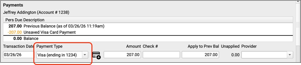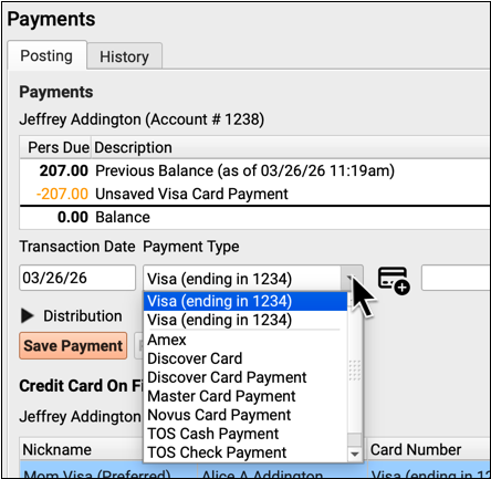 Once you’ve recorded credit card information for a family, it will be immediately available whenever you enter personal payments. Active cards will appear at the top of the Payment Type options. The preferred card will appear first.
