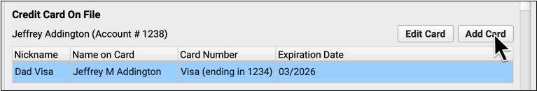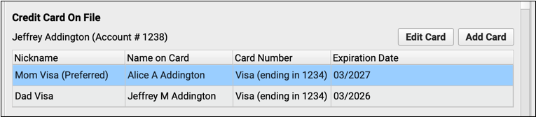 You can also add a card and manage all credit cards for a family in the Credit Card On File component. When a family has more than one credit card, you can designate one of them as preferred.
