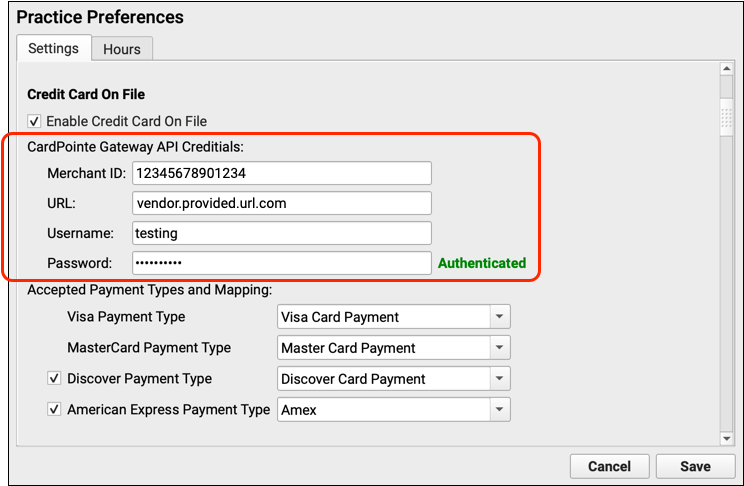 How will credit card on file payments appear in your records? Use the Credit Card on File section of Practice Preferences to designate payment types for each credit card. If you wish to create a new payment type, you can clone an existing one in the Payments table in the Tables tool.