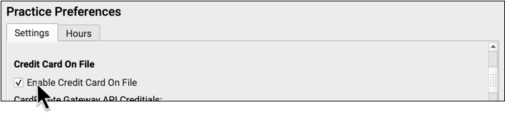After you have entered credentials and choosen payment types, you can click “Enable Credit Card On File” to turn on the service for your practice.