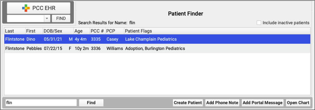 The patient finder is designed to help you find patients quickly and easily. Simply type all or a part a patient’s name and the finder will search all first and last names and show you the results. Inactive patients will not appear in patient search results unless “Include inactive patients” is checked.
