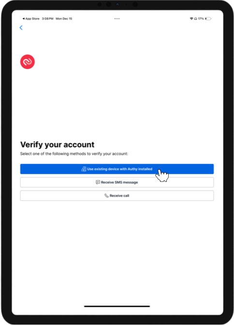 Choose a verification method for your account. If you choose “Use existing device with Authy installed”, Authy will send a notification to your main device requesting approval to add a new device to your account.