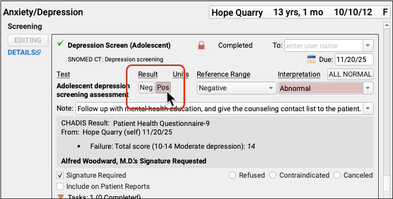 The CQM report looks for a positive result on the screening order and a subsequent follow-up action. Be sure to add a result to the order when your CHADIS questionnaires come in.