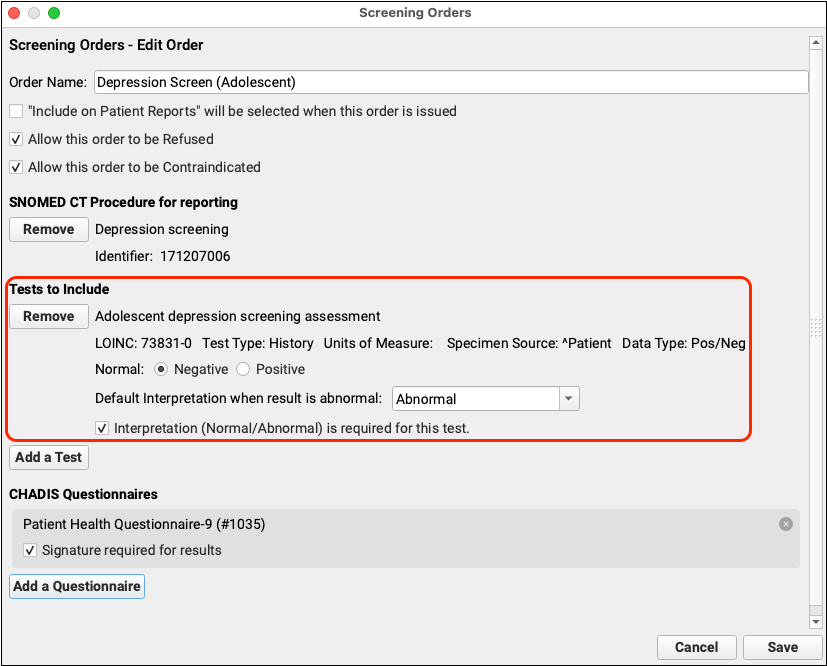 For the initial depression screening, you should add SNOMED-CT procedure code 171207006, and LOINC test code 73831-0, “Adolescent depression screening assessment”. (You could also add LOINC 73832-8, “Adult depression screening assessment” for an order for patients 18 years or older.) The test should have a Negative/Positive result.