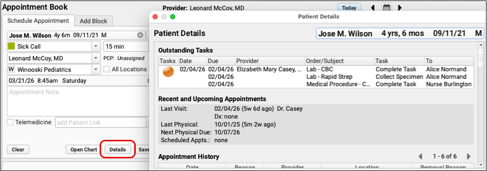 Details for each appointment can be viewed by highlighting the appointment and clicking the Details disclosure triangle.