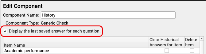 You can also indicate that the component should display the patient’s last answer on the chart note.