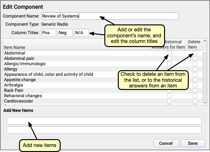 The Generic Check component displays a list of items with checkboxes next to them. While charting, a user can check or uncheck items in the list, and add notes for each item that will be stored in “answer memory”, either by provider or by patient.