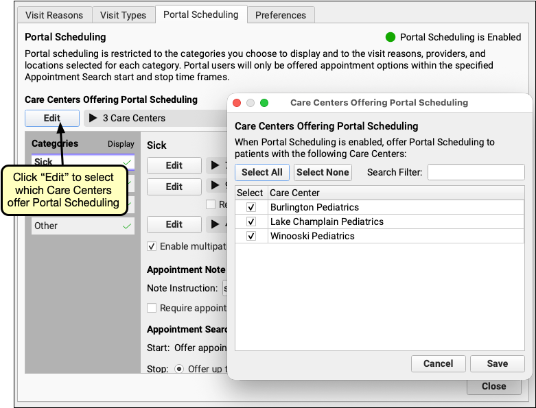 Click the “Edit” button under “Care Centers Offering Portal Scheduling” in the Scheduling Configuration tool. Select which care centers allow scheduling through the patient portal.