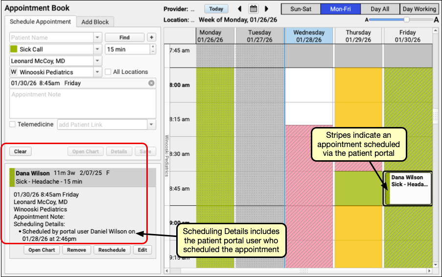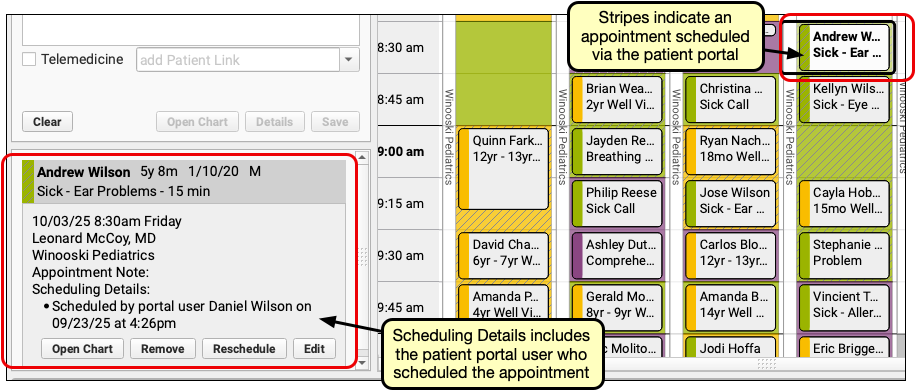 Appointments scheduled through the patient portal marked with a stripe pattern in the Appointment Book and the visit reason column of the Schedule queue.
