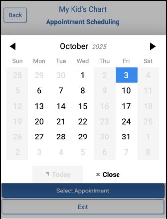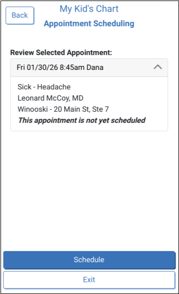 At any time, prior to clicking “Schedule” you click “back” to return and change selections in a previous step, or click “Exit” to return to the patient portal home page without making an appointment.