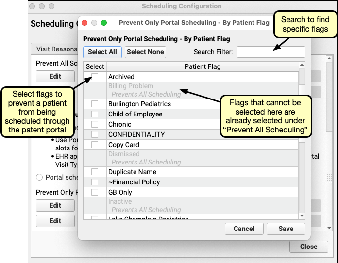 Flags already checked under “Prevent All Scheduling” will not be available to select, since preventing all scheduling already prevents patient portal scheduling.