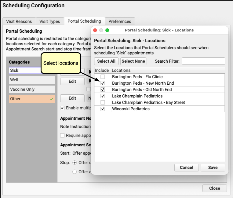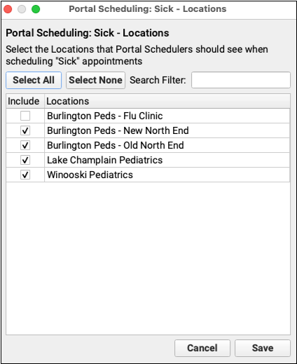 As with Visit Reasons and Providers, select which locations should be available for portal scheduling. If you have locations that have odd hours or need more attention when scheduling, such as a pop-up flu clinic, you may wish to leave those unchecked.