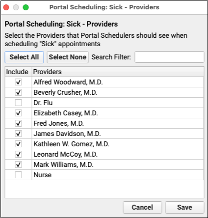 Select the providers that handle the visit reasons you selected above. You may wish to exclude providers that are placeholders for scheduling, such as an “Office” or “Flu” provider, or specialists who you would prefer to schedule over the phone.
