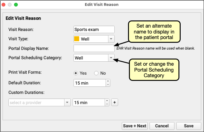 The Portal Scheduling Category for the selected visit reason can be set or edited You can set an alternative Portal Display Name to appear in the patient portal instead of the Visit Reason name.