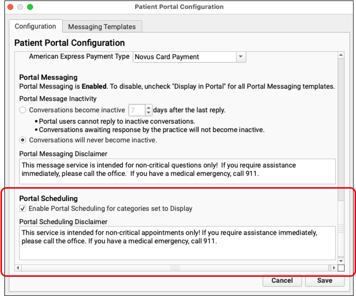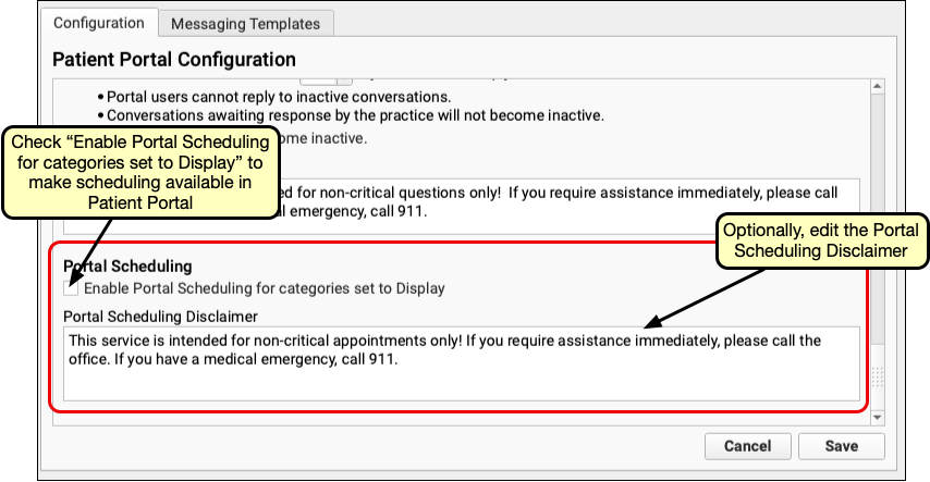 Also in Patient Portal Configuration review and, if needed, edit the Portal Scheduling Disclaimer, to ensure that the text displayed to portal users reflects your practice’s needs.