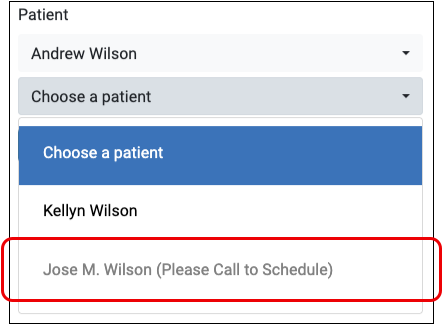 Patients with privacy enabled, or who have a status flag that prevents scheduling, or are assigned to a care center that does not use patient portal scheduling, cannot be selected and are marked with “Please Call to Schedule”.