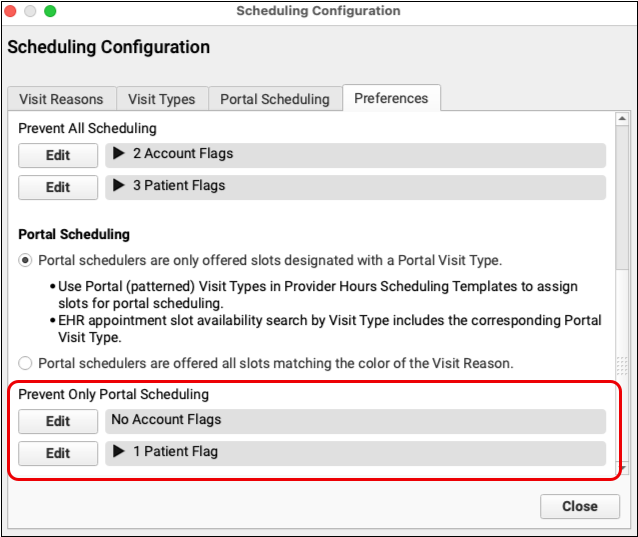 Open the Preferences tab in Scheduling Configuration. Click “Edit” for Account or Patient flags and select any flag that should prevent a patient from being scheduled through the patient portal.