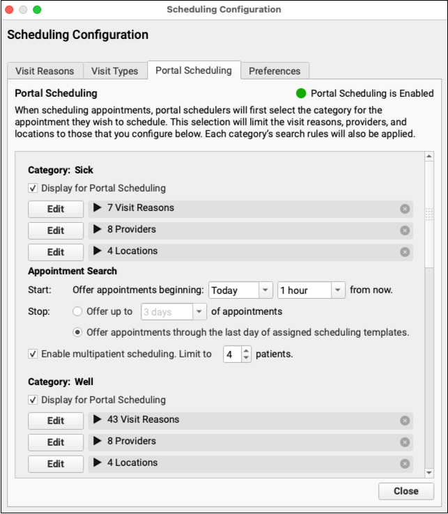 Click “Edit” to open any visit reason, and manage that visit reason’s Portal Scheduling options.