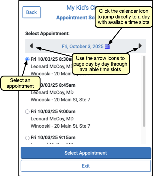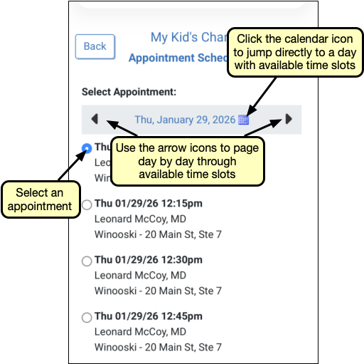 Use the arrow buttons to page day-by-day through available appointment time slots, or click the calendar icon to view available dates a month at a time.