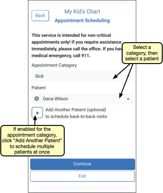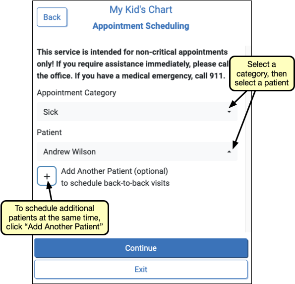 Select a patient and visit category. If enabled in Portal Scheduling Configuration, additional patients can be scheduled by clicking the “Add Another Patient” button.