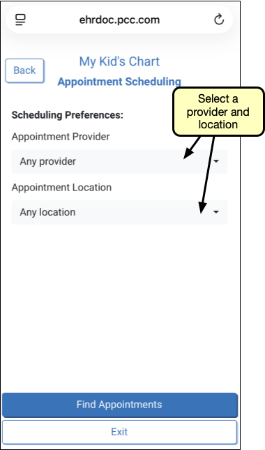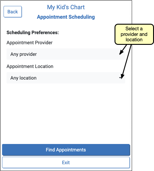 Select a provider and location from the “Appointment Provider” and “Appointment Location” menus. “Any Provider” and “All Locations” are available options and will check for availability across all available providers and all available locations.