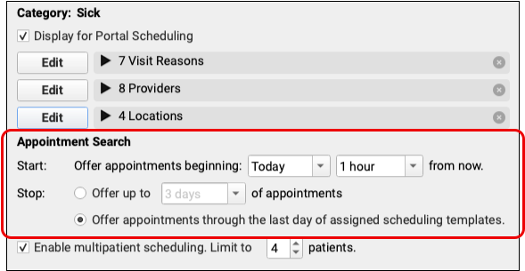 By default, multipatient scheduling is enabled for each scheduling category and is set to a maximum of two patients. When available, patient portal users can select additional patients, up to the maximum set here.