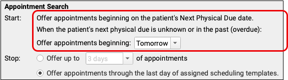 The start date for a Well Visit uses the patient’s Next Physical Due date. If that due date is in the past or is blank, portal scheduling will offer appointments beginning on the current or following day, depending on your choice here.