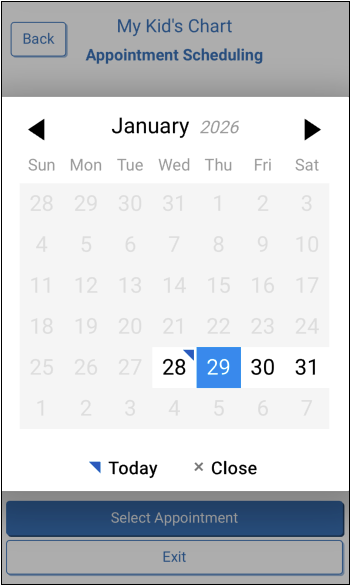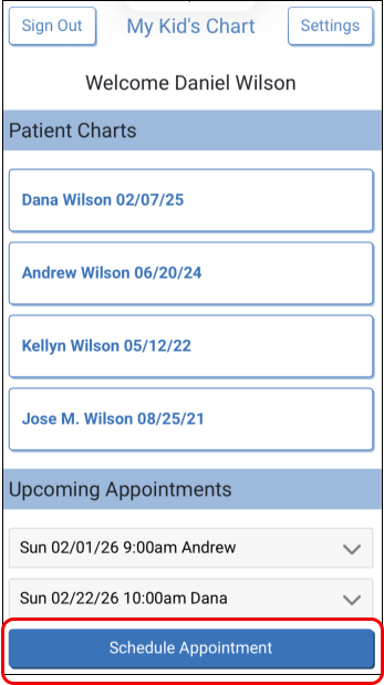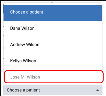 Patients without a PCP, or with a PCP not configured for patient portal scheduling, will appear in gray text on the Choose a Patient menu.
