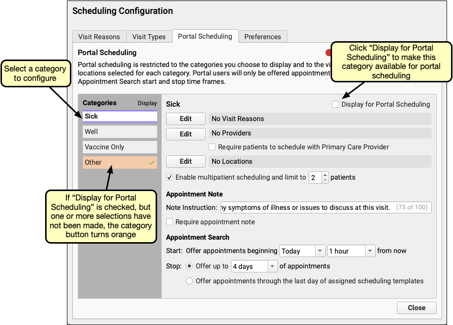 Each category is optional. For each category you intend to use, check “Display for Portal Scheduling”.