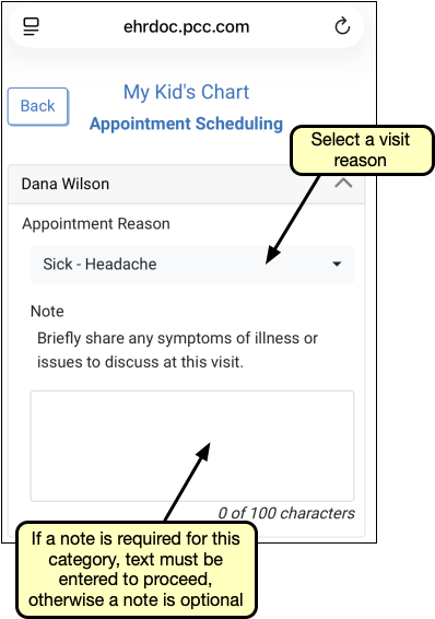 For each patient, select a specific visit reason within the category, then optionally add a note such as symptoms, discussion subjects, or other information relevant to this appointment.