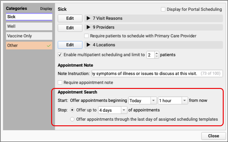 Set the appointment search range for each category. The patient portal searches for time slots matching the criteria set during scheduling. The range of time from first available time slot to the last is set under “Appointment Search”.
