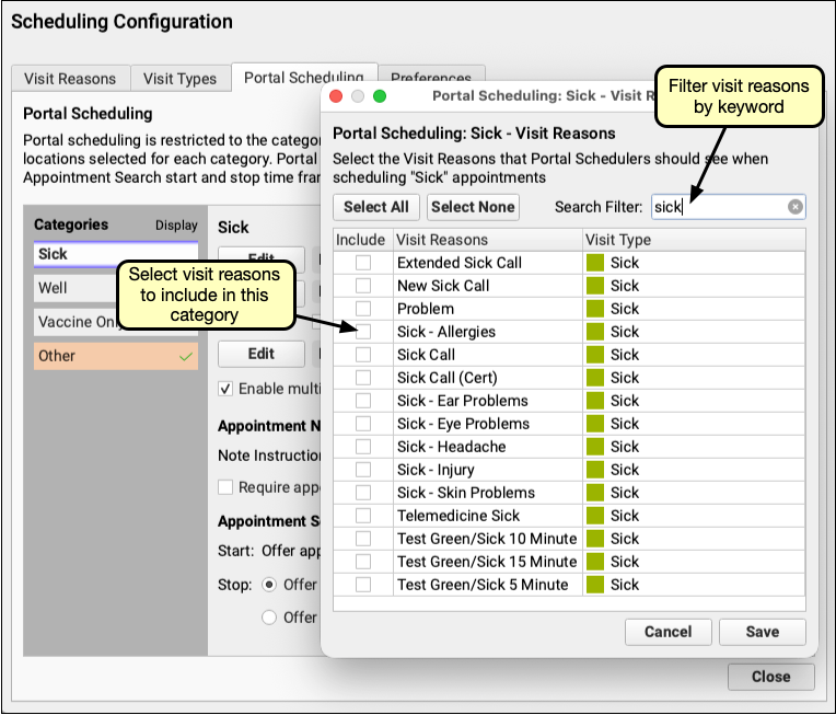The Visit Reasons tab includes a Portal Scheduling column, which displays the category of each visit reason, Sick, Well, Vaccine Only, Other, or not enabled.