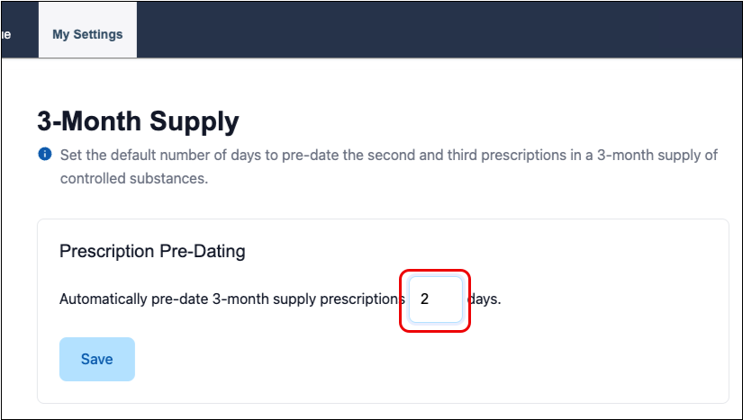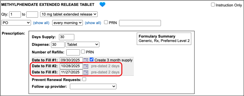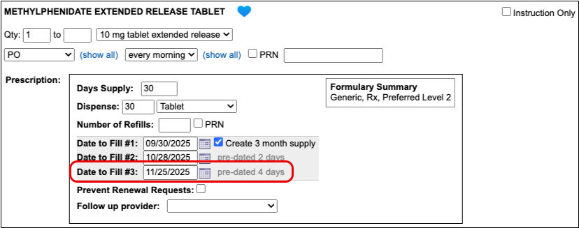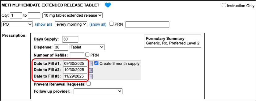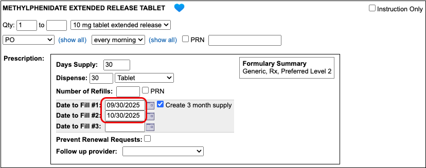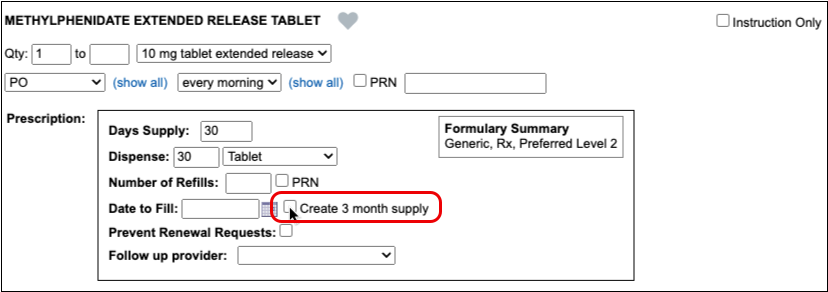 Prescribe Multiple Months’ Supply of Schedule II Controlled Substances: If you are prescribing a Schedule II controlled substance, you can turn a single prescription into a three- or two-month supply in one click. Only users in certain roles can prepare, sign, and send controlled substance prescriptions. You can learn more about prescribing controlled substances in the article Prescribe Controlled Substances.