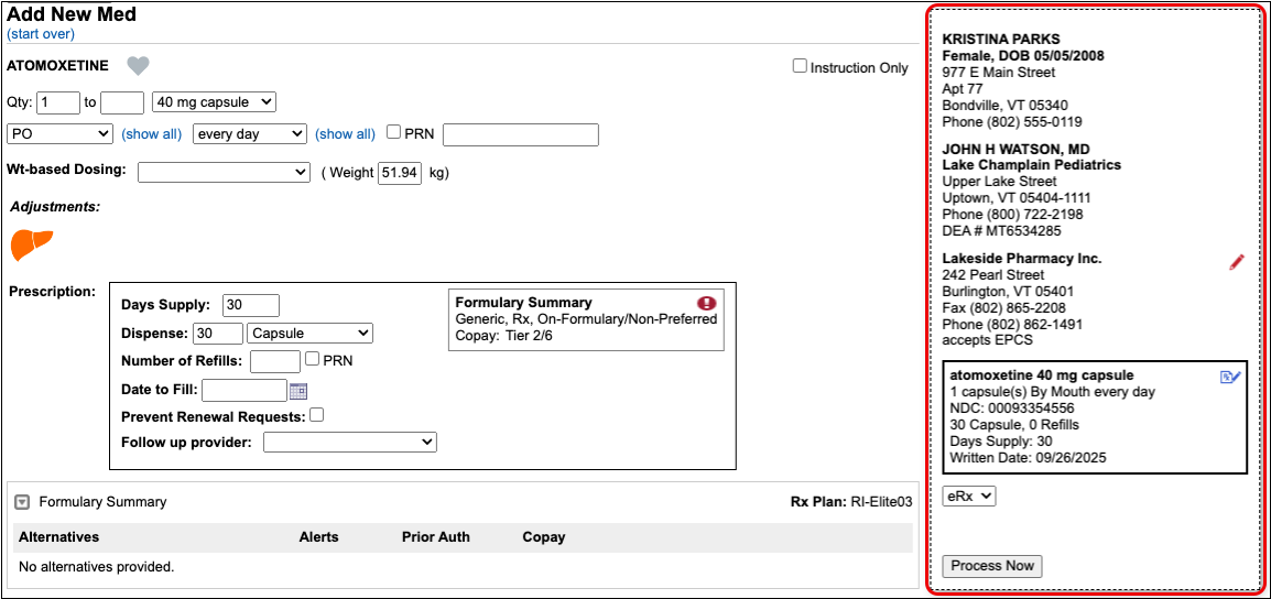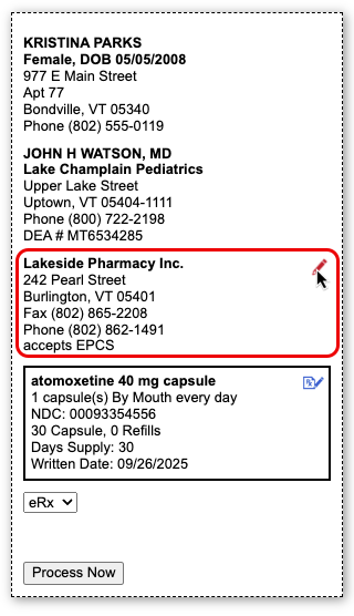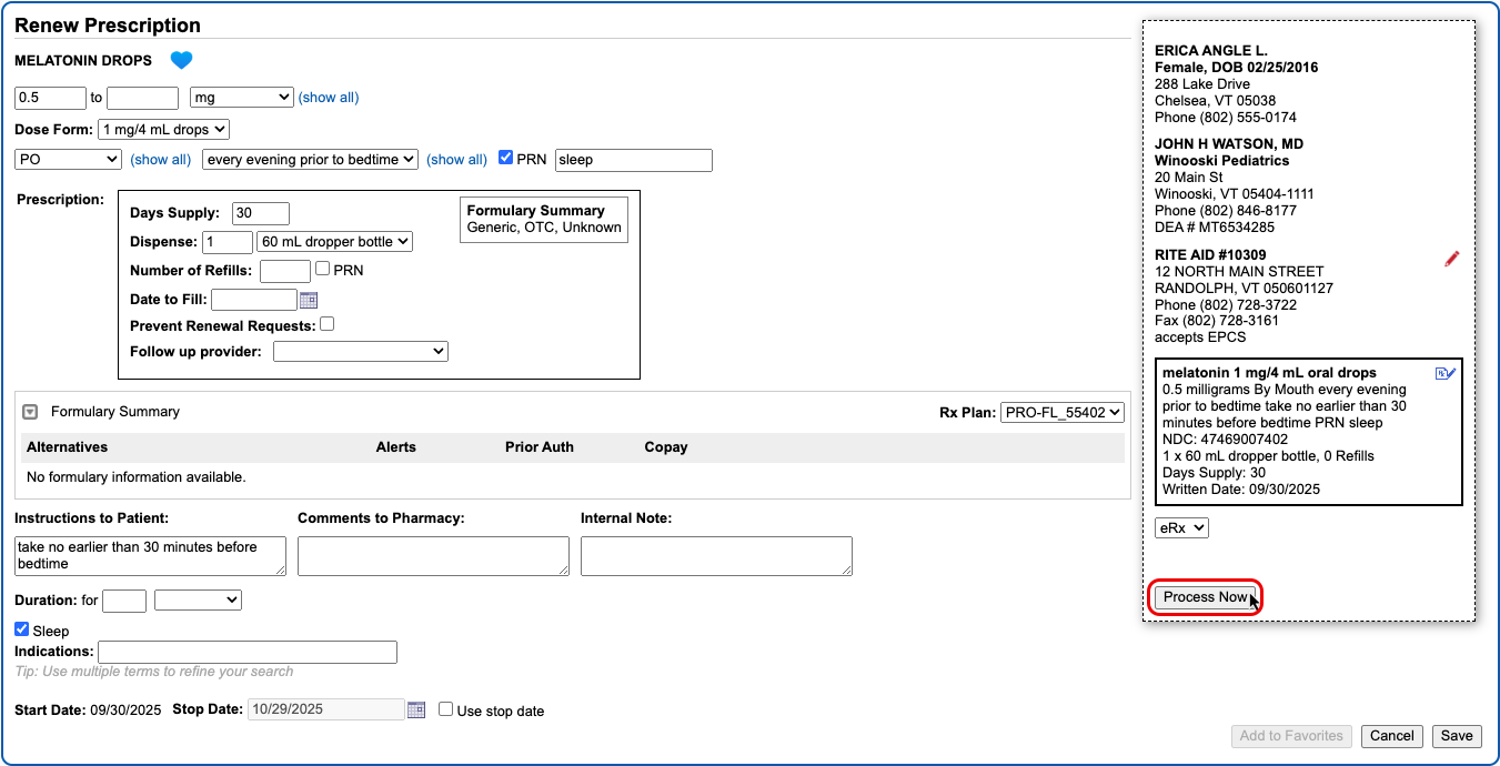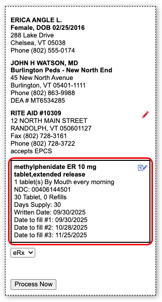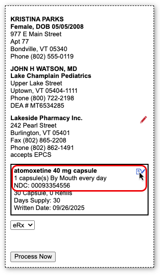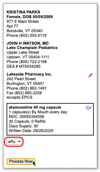 To send the prescription electronically, verify that “eRx” is selected on the prescription preview and click the “Process Now” button.