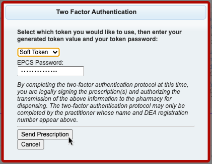 Authentication Required for Electronic Prescribing of Controlled Substances (EPCS): When processing electronic prescriptions for controlled substances, you must prove your identity by entering a personal password and a code generated by an electronic authentication token that is tied to your NPI and DEA credentials. To learn more about electronic prescribing of controlled substances and how to obtain an electronic authentication token, read Prescribe Controlled Substances.
