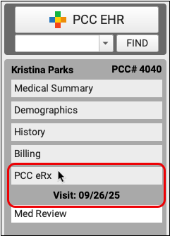 In the patient’s Visit History, find and open the encounter where the medication was prescribed, then click the PCC eRx button.