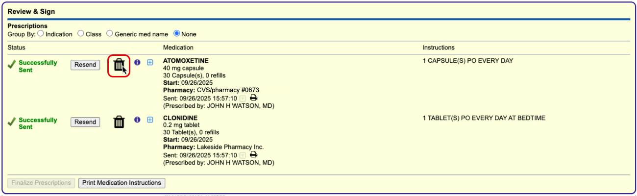 Jump to the Review & Sign section, then click the trash can icon beside the prescription that was sent or printed in error. If the prescription has passed its stop date, you will not be able to delete it.