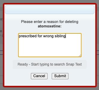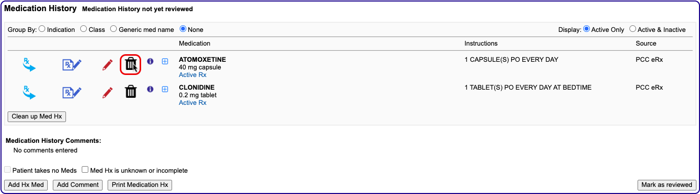 Deleted prescriptions get removed from the Review & Sign component and the patient’s Prescription History, but the medication remains active in the patient’s Medication History. You can delete the medication from the patient’s history by clicking the trash can icon beside it and recording a reason for deletion.
