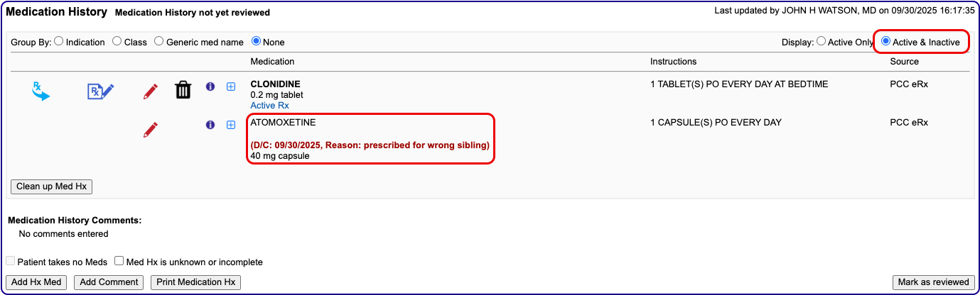 Deleted medications and their reasons for deletion appear in the inactive section of the patient’s Medication History.