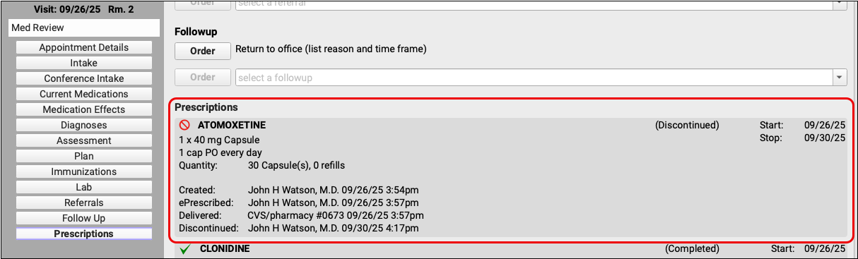 For maximum transparency, prescriptions deleted in this manner continue to appear in the Prescriptions component of the patient’s encounter note in PCC EHR, albeit with an updated status indicating that they have been discontinued.