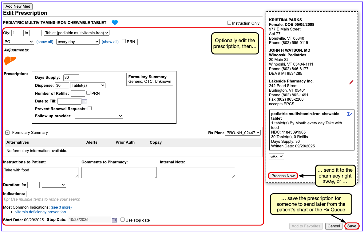 Once written, you can electronically send the prescription to the pharmacy, print a physical copy, or save and process it later.