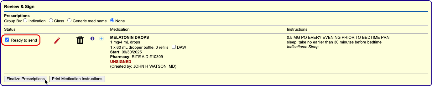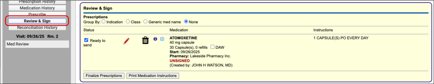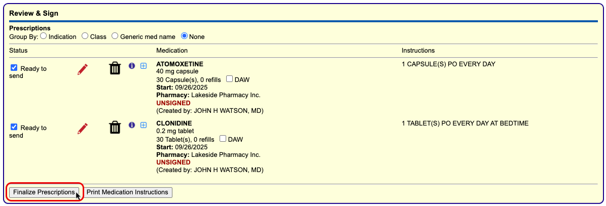 Go to the Review & Sign component and click “Finalize Prescriptions”.