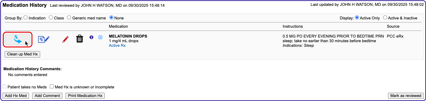 When a patient is out of refills for a prescription, you can renew it from the Prescription History or Medication History component in PCC eRx.