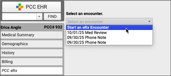 Optionally Create an eRx Encounter: If you wish to review eRx information for a patient and there is no corresponding visit note, phone note, or portal message, click the “PCC eRx” button in the patient’s chart and choose the “Start an eRx Encounter” option from the “Select an encounter” drop-down.