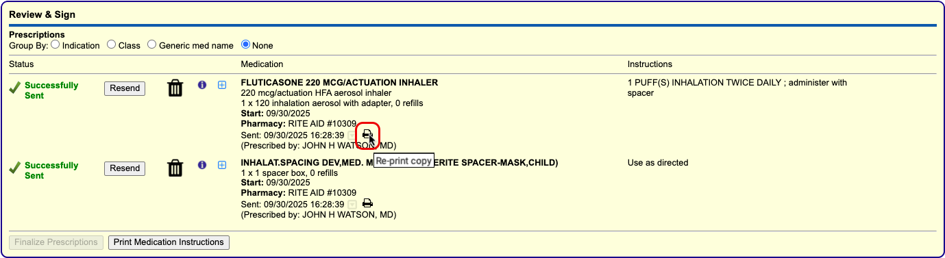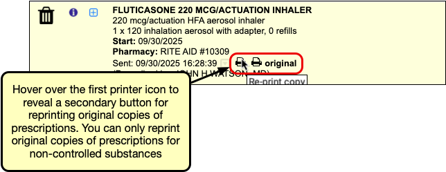 To reprint an original copy of a prescription for a non-controlled substance, hover over the printer icon in Review & Sign and click the secondary icon that appears beside it.