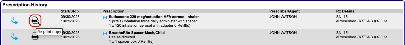 Click the printer icon beside any processed prescription to print a void copy of it for documentation purposes.